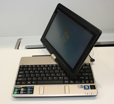 The Gigabyte G-Style T1005M Convertible Tablet is powered by a 1.5GHz Intel Atom N550 dual-core processor, a 10.1-inch swivels multitouch LED-backlit display with resolution of 1366×768 pixel (WXGA), up to 2GB of DDR3 RAM, 320GB hard drive, Intel GMA3150 graphics processor, USB 3.0, two USB 2.0 ports, optional 3.5G modem, 802.11b/g/n Wi-Fi, a built-in 1.3 MP camera, a 6-cell Li-Ion battery, and runs Microsoft Windows 7 Home Premium OS.
